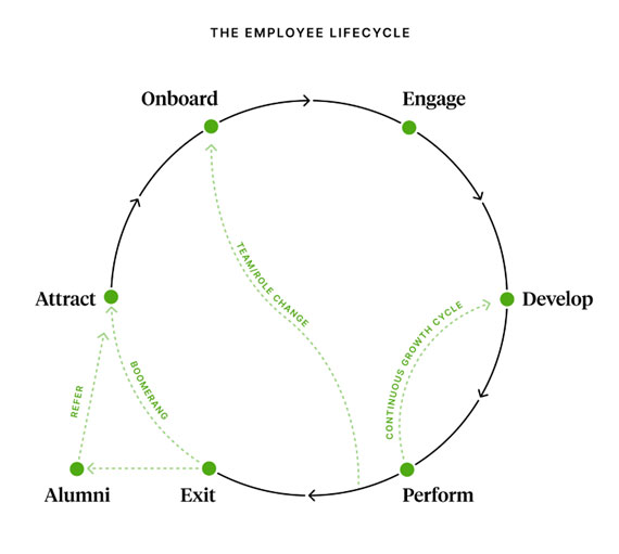첫째, 유치(Attract) 단계에서 지원자는 회사에 대한 정보와 JD(Job Description)을 통해 자신에게 적합한 곳인지 확인하며 회사의 입사 유무를 결정합니다. 그렇게 입사한 직원은 온보딩(Onboard) 단계를 거치며 회사와 직무에 빠르게 적응할 수 있도록 다양한 교육을 받으며 지식을 쌓게 됩니다. 시간이 흘러 참여(Engage) 단계에 이르러 회사에 대한 이해가 깊어지면 직원들은 동기를 부여받고 결속력이 생깁니다. 성장(Develop) 단계에서 직원들은 업무를 맡고 피드백을 받으며 역량을 개발하게 됩니다. 수행(Perform) 단계에서 직원들은 자신들의 퍼포먼스를 평가받고 성과를 인정받습니다. 언젠가 직원은 조직을 떠나 인생의 새로운 챕터로 넘어갑니다. 이것이 바로 이탈(Exit) 단계이죠. 직원이 퇴사하자마자 기업과의 연결고리가 끊기는 것은 아닙니다. 근무기간 동안 직원 경험이 긍정적이었다면 직원은 퇴사 후에도 기업을 응원하고 주변에 추천합니다. 이를 직원 여정의 진정한 종착역, 지지(Alumni) 단계라고 합니다.