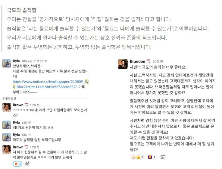 “입사 전엔 ‘극도의 투명함, 극도의 솔직함’이라는 말이 솔직히 과장처럼 느껴졌어요. 그런데 일하면서 느꼈어요. 여긴 정말 솔직하지 않으면 대화가 안 돼요.” – 강남언니 블로그 ‘Core Values’ 포스트