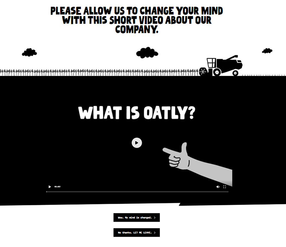 짧은 Oatly 소개 영상을 보여주며 한 번만 설득할 기회를 달라며 붙잡습니다. 이 회사에 채용되어 커리어가 시작될지도 모른다며 으름장 놓던 Oatly가 맞나 싶을 만큼 달라진 모습입니다.
