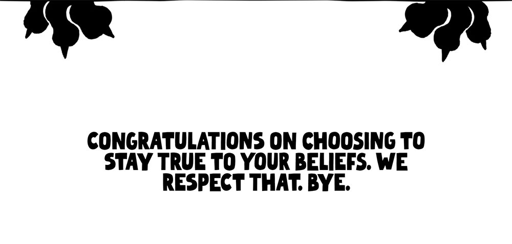 | 축하합니다. 당신은 신념에 충실하기로 결정했고, 우린 그걸 존중합니다. 안녕히 가세요. |